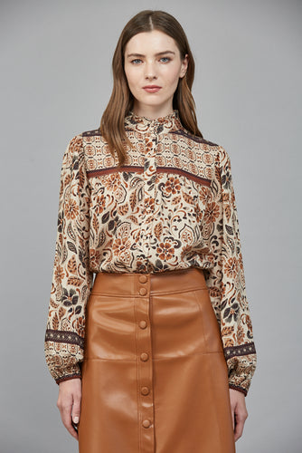 Fran Puff Sleeve Black top with Tan Floral pattern