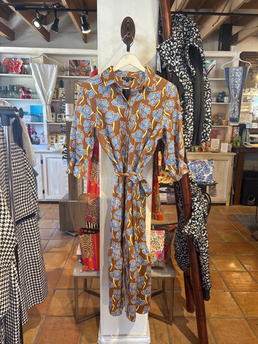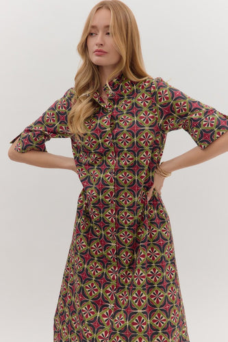 Nellie Green leaf pattern Button Down Dress with Tie waist