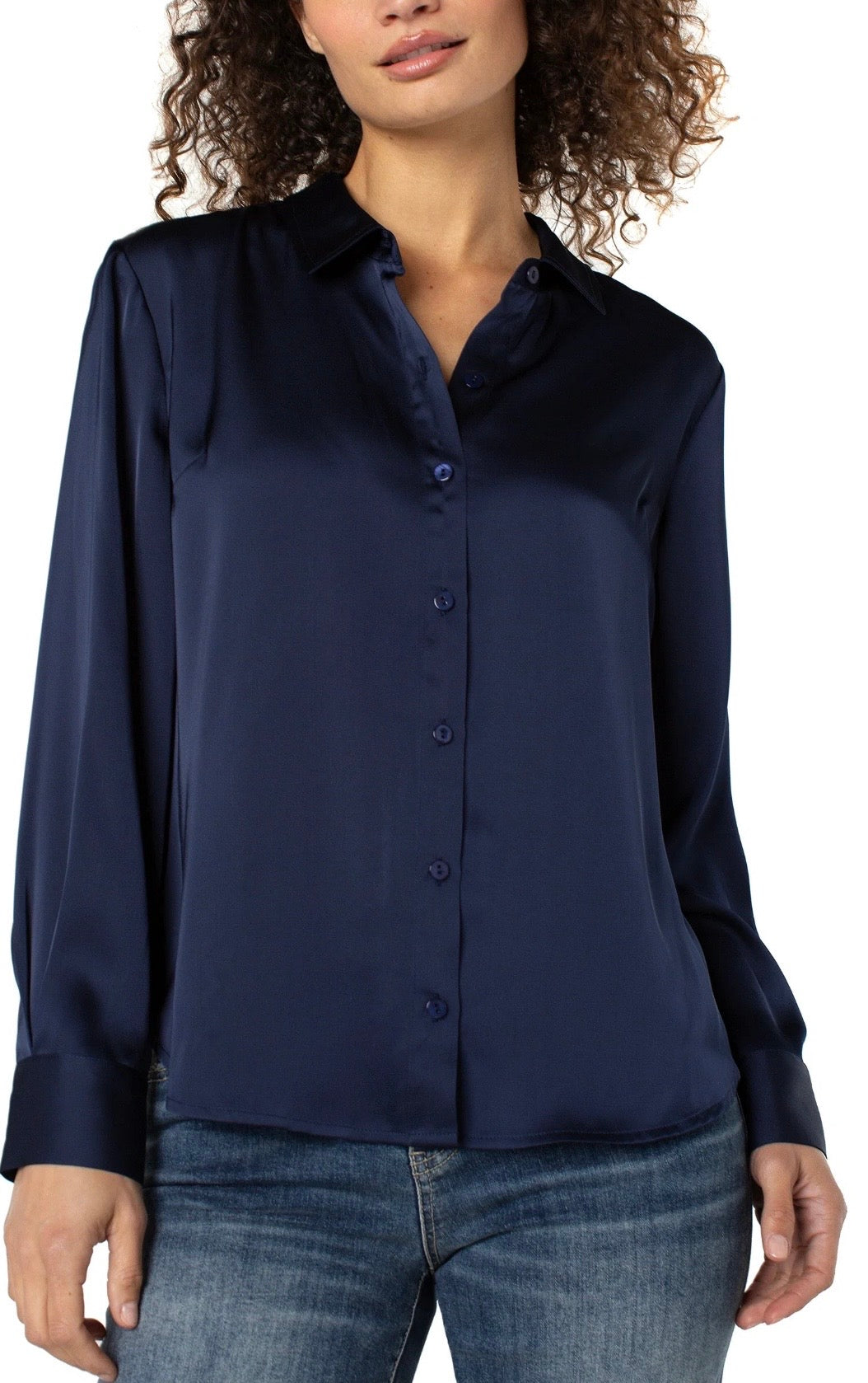 This long sleeve woven shirt is designed in a lustrous fabric that catches the light with every move. Featuring a classic collar, button front, and refined back box pleat, it delivers an effortless balance of polish and ease. Finished with buttoned cuffs and a curved hem for versatile styling — wear it tucked, tied, or layered for an elevated take on everyday dressing.