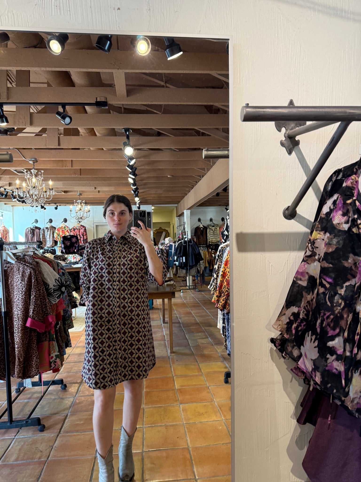 The Bernie Geo Button Down Patterned Dress features a sophisticated geometric design paired with practical 3/4 sleeves for versatile wear. Its button-down front allows for easy adjustment and styling, while the tailored fit enhances silhouette definition. Ideal for both professional settings and casual outings, this dress delivers a polished, contemporary look with comfortable movement. Crafted to balance style and function, it is a refined addition to any wardrobe.