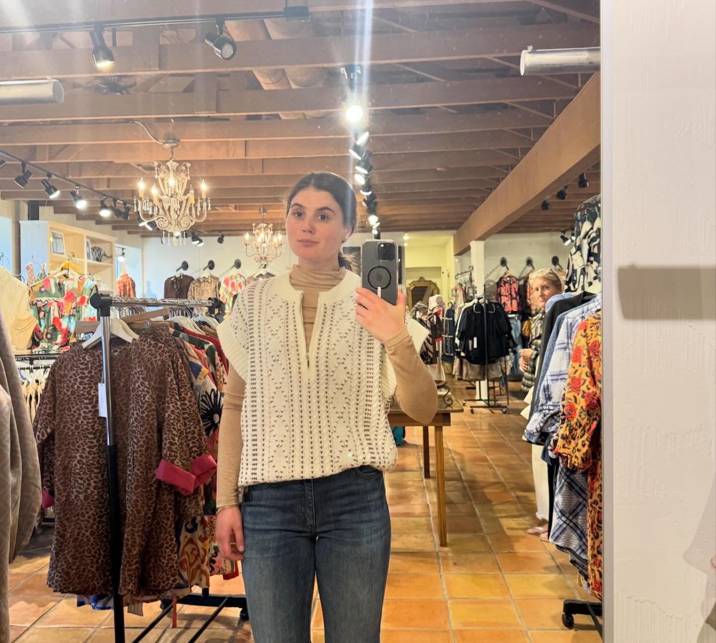 An elegant addition to your wardrobe, the Carlie cap sleeve sweater features a cream color with a bold beige pattern. The dolman cap sleeves and zip neck add a touch of sophistication to this cozy sweater. Perfect for a day out or a casual evening in.