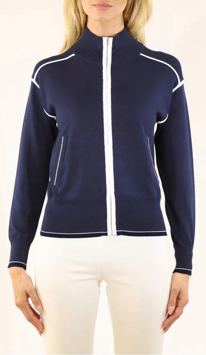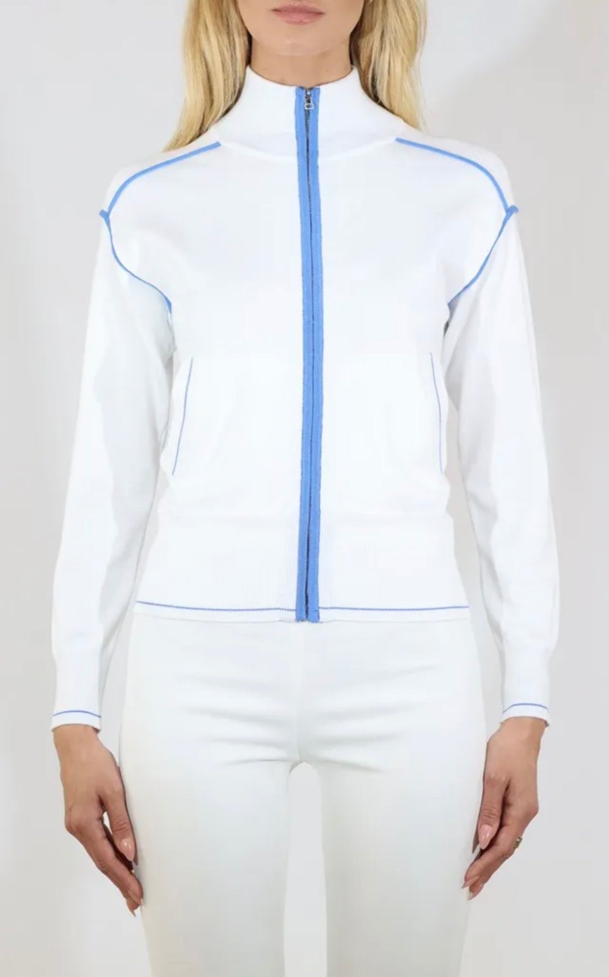 Elevate your layering game with the Connie White Zip Sweater, a versatile essential that transitions seamlessly from casual to polished. Crafted in crisp white with contrasting trim in Humid Blue and Navy, this piece features functional pockets and a full zip closure for effortless styling. Wear it as a cozy sweater for everyday comfort or layer it as a lightweight jacket over your favorite athleisure pieces. The thoughtful color blocking adds visual interest while maintaining the neutral palette that pairs with everything in your wardrobe.